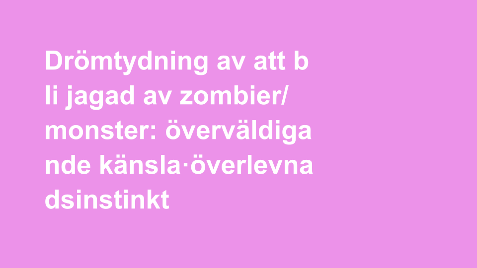 Att drömma om att bli förföljd av zombies eller monster kan symbolisera olika känslor och tankar. Ofta representerar dessa drömmar en känsla av osäkerhet eller stress i det verkliga livet. Kanske känner du dig överväldigad av ansvar, eller så kämpar du med en specifik situation som gör att du känner dig jagad. Det kan också handla om att du försöker fly från något i ditt liv som du inte vill konfrontera.